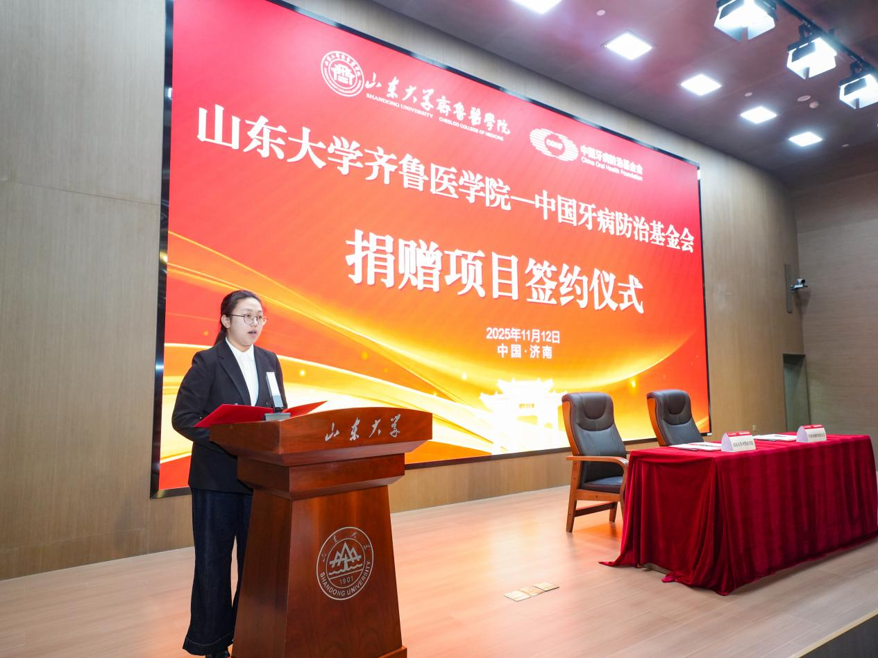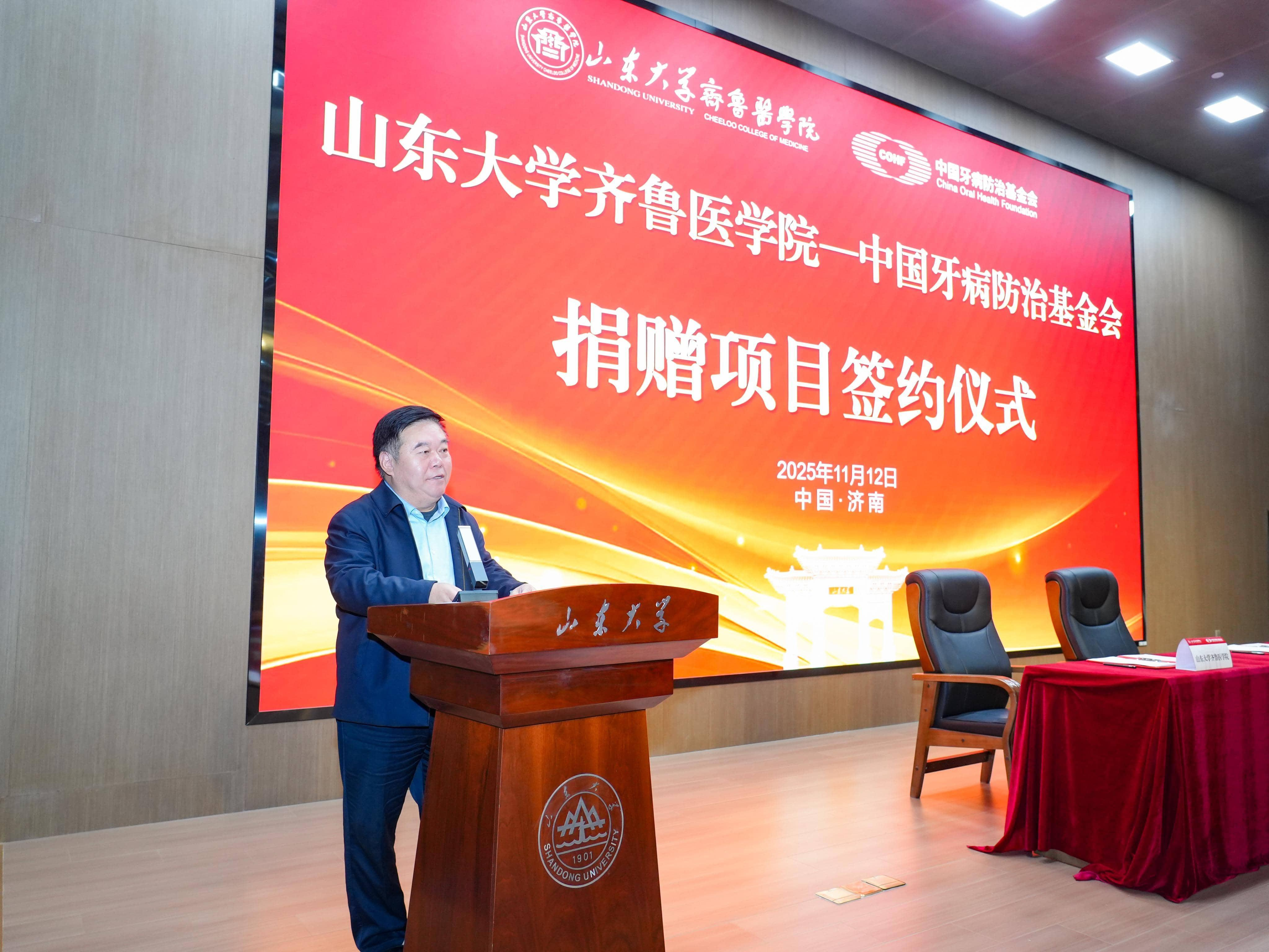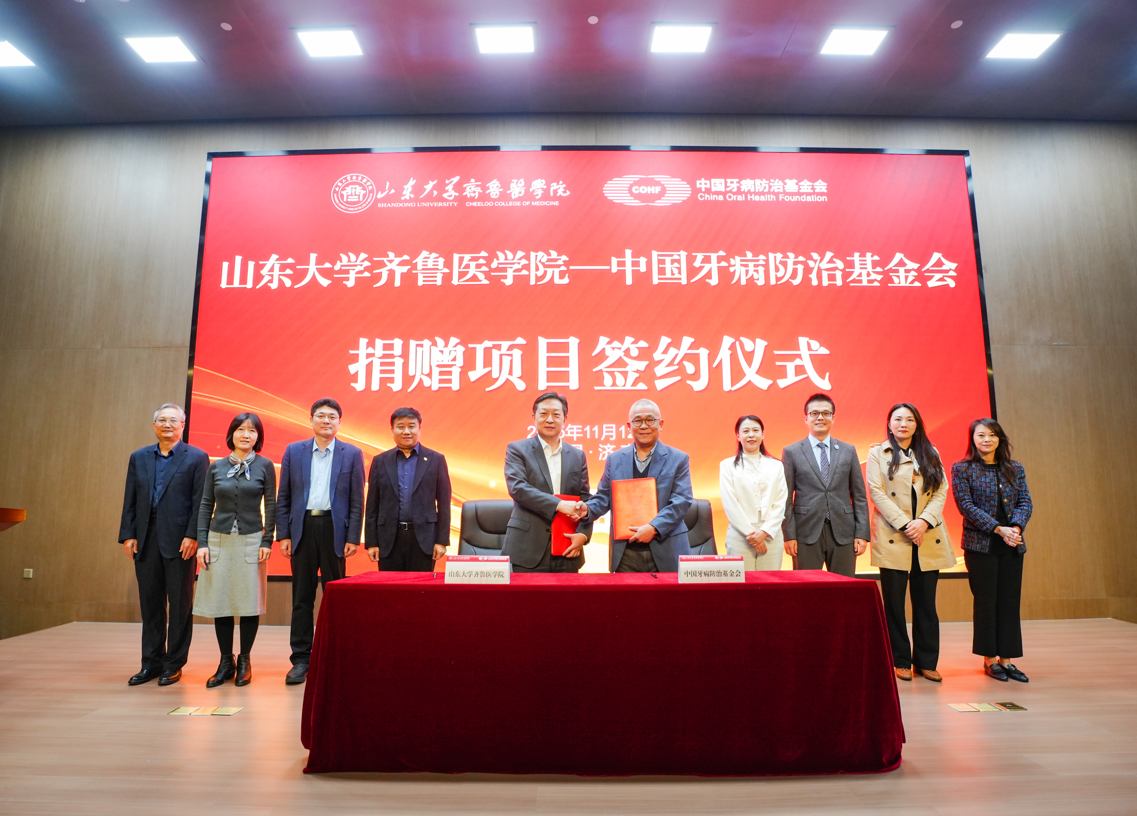 2025年11月12日,山东大学齐鲁医学院与中国牙病防治基金会“守护百万口好牙——焕新生活,从齿开始”捐赠仪式在趵突泉校区举行。中国牙病防治基金会理事长李铁军、常务副秘书长马莉莉,山东大学齐鲁医学院党工委书记、齐鲁医院(第一临床学院)党委书记陈鑫出席仪式。仪式由齐鲁医学院党工委副书记、公共卫生学院党委书记赵福昌主持。