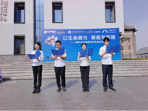 中心工作人员与药学院学生代表共同朗诵了由本校学生创作的征文作品《无言的丰碑》。深情的诵读,引领在场师生共同致敬那些“无言的科学伙伴”。随后,全体人员肃立,为献身于科学研究事业的实验动物默哀一分钟,现场气氛庄重,敬意无声流淌。