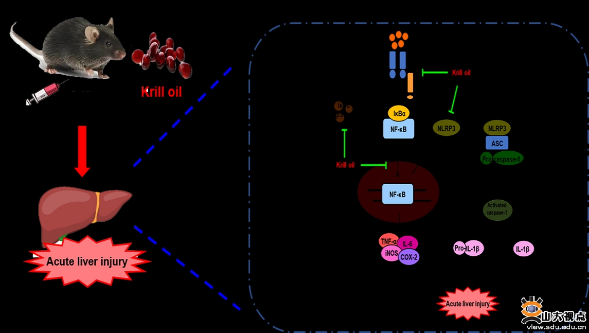 多种因素如病毒感染、酒精、药物等可导致急性肝损伤,甚至发展为肝衰竭,成为重大健康威胁。因此,寻找新的并且安全有效的保护肝损伤的营养干预措施具有重要意义。本团队发现,富含磷脂型EPA/DHA和虾青素等多种生物活性成分的南极磷虾油能有效保护脂多糖所致小鼠急性肝损伤,其分子机制可能与抑制TLR4/NF-κB/NLRP3信号通路活化有关。该研究内容以“Krill oil prevents lipopolysaccharide-evoked acute liver injury in mice through inhibition of oxidative stress and inflammation”为题发表于英国皇家化学会(RSC)主办的食品营养领域国际期刊Food & Function(JCR一区,IF=5.396),杜磊副教授为该论文第一作者,吴昊教授和苏国海教授为共同通讯作者。王保珍副教授,郭欣副教授,硕士研究生黄玉洁、郝仪铭和陈晨参与了该项研究工作,山东大学为第一和通讯作者单位。