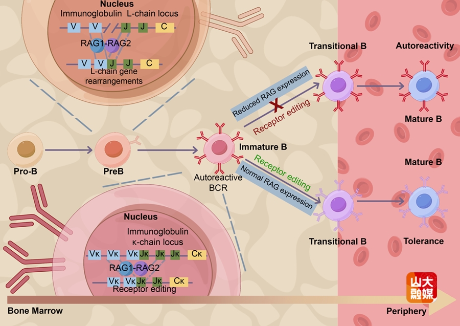 本研究将ITP的发病“上溯”到未成熟B细胞的中枢免疫耐受阶段,提供了从分子(RAG↓、IGK V–J基因组距离缩短)到功能(抗血小板/多反应性抗体积累)再到因果关系(体内模型)的一条完整证据链条,深化了人们对于ITP发病机制的理解;此外,IGK V–J基因组距离与受体编辑水平之间的量化关系,具有反映中枢免疫耐受状态的潜在临床预测价值。就治疗策略而言,单纯清除外周成熟B细胞(如抗CD20单抗)可能无法根治源头,因此,针对未成熟/发育早期的致病性B细胞或恢复/调控RAG介导的受体编辑过程,为ITP等自身免疫性疾病的长期缓解提供了新方向。