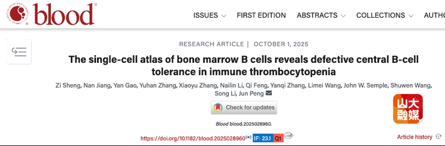 近日,山东大学齐鲁医院彭军、李松和王姝文团队在国际血液学顶刊Blood(中科院一区Top,IF = 23.1)杂志发表了题为The single-cell atlas of bone marrow B cells reveals defective central B-cell tolerance in immune thrombocytopenia的研究论文。本研究系统描绘了免疫性血小板减少症(ITP)患者骨髓B细胞的全景图谱,揭示了中枢B细胞耐受缺陷的关键分子机制。山东大学齐鲁医院教授彭军、副教授李松、副研究员王姝文为共同通讯作者,齐鲁医院绳紫、姜楠、高岩(现淄博市中心医院)为共同第一作者,山东大学齐鲁医院为第一作者和通讯作者单位。