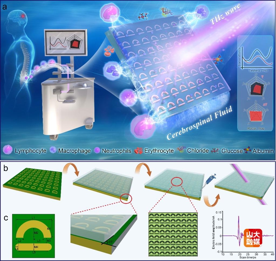 近日,山东大学齐鲁医院神经外科李刚/薛皓教授团队与枣庄学院梁兰菊教授团队在国际期刊ACS Sensors(中科院一区,IF:9.1)发表了题为“Slope Extrusion Microchannel Integrating Terahertz Meta-Sensor Embedded in Cerebrospinal Fluid for Precise diagnosis of PCNSIs”的研究成果,该研究提出一种采用斜向挤压技术集成超表面的新型太赫兹生物传感器,用于检测脑脊液中白细胞浓度和多核细胞/单核细胞比例变化,为神经外科术后中枢神经系统感染(PCNSI)及其严重程度的床边快速诊断提供了全新方法。齐鲁医院博士研究生王青桐、亓彦华,硕士研究生王传争;枣庄学院教授王子群、硕士研究生田汇涵为论文共同第一作者。齐鲁医院神经外科教授李刚、薛皓,枣庄学院教授梁兰菊、姚海云为论文共同通讯作者。山东大学齐鲁医院为第一作者单位。