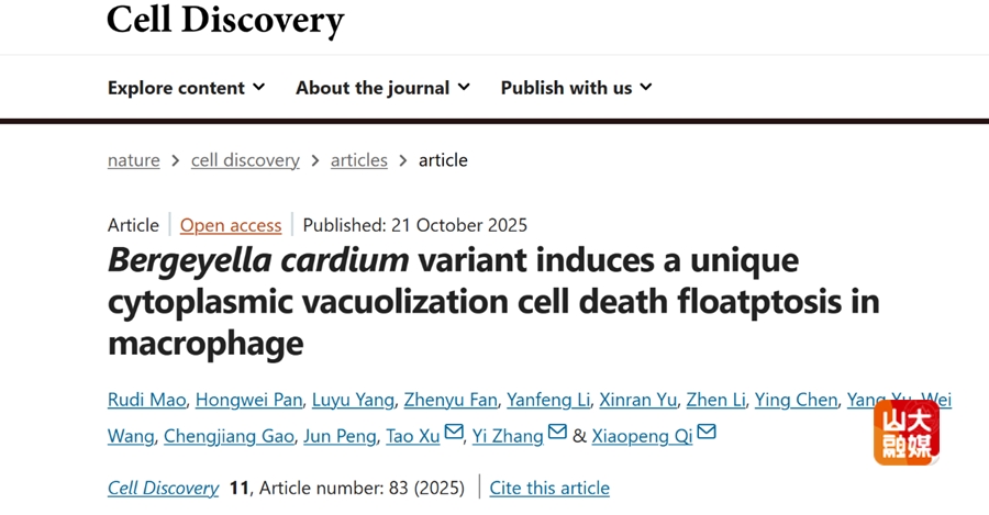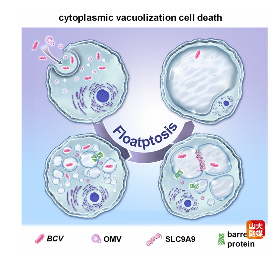 近日,山东大学齐鲁医院检验医学中心张义团队与高等医学研究院齐晓朋团队在国际权威期刊Cell Discovery(中科院一区TOP,影响因子14.3)在线发表了题为“Bergeyella cardiumvariant induces a unique cytoplasmic vacuolization cell death floatptosis in macrophage”的研究长文。该研究系统揭示了一种由新发病原菌Bergeyella cardium变异株(BCV)诱导的全新程序性细胞死亡方式——“Floatptosis”,为理解宿主抗感染免疫机制和发展新型抗感染策略提供了重要理论依据。山东大学齐鲁医院检验医学中心张义、高等医学研究院齐晓朋与徐涛为共同通讯作者;高等医学研究院毛如迪、齐鲁医院检验医学中心潘宏伟等为共同第一作者。
