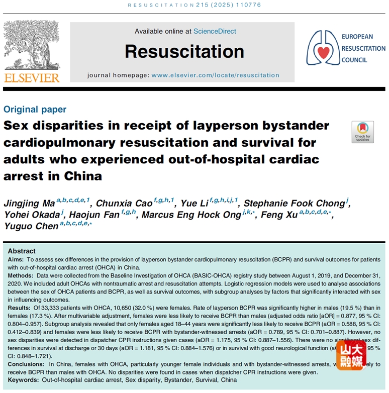近日,山东大学齐鲁医院急诊科、教育部急危重症医药基础研究创新中心、山东省急危重症临床医学研究中心陈玉国/徐峰团队在国际急诊医学领域权威期刊Resuscitation(中科院1区)在线发表了题为“Sex disparities in receipt of layperson bystander cardiopulmonary resuscitation and survival for adults who experienced out-of-hospital cardiac arrest in China”的研究论文。该研究基于齐鲁医院急诊团队牵头开展的我国首个全国性、前瞻性的心脏骤停队列(The BASeline Investigation of Cardiac Arrest,BASIC),评估了中国院外心脏骤停(OHCA)患者中旁观者心肺复苏(BCPR)及生存结局的性别差异,对于提高旁观者心肺复苏术实施率、进一步改善心脏骤停患者生存率具有重要意义。山东大学齐鲁医院副主任医师马静静为论文第一作者,陈玉国教授、徐峰教授为共同通讯作者。山东大学齐鲁医院为第一和通讯作者单位。