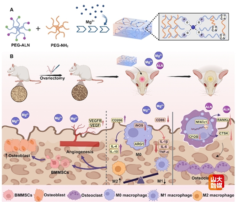骨质疏松症增加了骨折风险,由于局部免疫失衡、破骨细胞活性亢进、成骨能力下降及血管生成受损,骨质疏松性骨折的愈合过程与正常骨折相比更加缓慢且困难。全身给药存在生物利用度低、副作用大等问题,而局部递送系统能够精准调控病灶微环境,协同抑制骨吸收并促进骨形成,为骨质疏松性骨折修复提供了新策略。基于以上科学问题,合作团队构建了一种聚乙二醇(PEG)-阿仑膦酸钠(ALN)-镁离子(简称PAMg)双交联水凝胶,通过酰胺键与金属配位协同形成可降解高分子网络,实现ALN与Mg²⁺的持续共释放。该体系创新性地将Mg²⁺的免疫调节、成骨/成血管效应与ALN的强效破骨抑制能力相结合,在骨质疏松模型中同步调控免疫微环境、增强骨生成与血管化,并抑制骨吸收(图2),该水凝胶能够显著促进骨质疏松条件下的骨缺损修复与再生。该成果以“Engineered Poly(ethylene glycol)-Alendronate-Magnesium Hydrogels Potentiate Site-Specific Immunomodulation for the Healing of Osteoporosis Fractures”为题发表在Advanced Functional Materials。崔基炜教授、刘新宇教授、中国科学院兰州化学物理研究所研究员胡徐智为该论文的共同通讯作者,山东大学齐鲁医院博士后尤云昊和化学与化工学院博士研究生魏绍银为论文共同第一作者,山东大学齐鲁医院为第一和通讯作者单位。