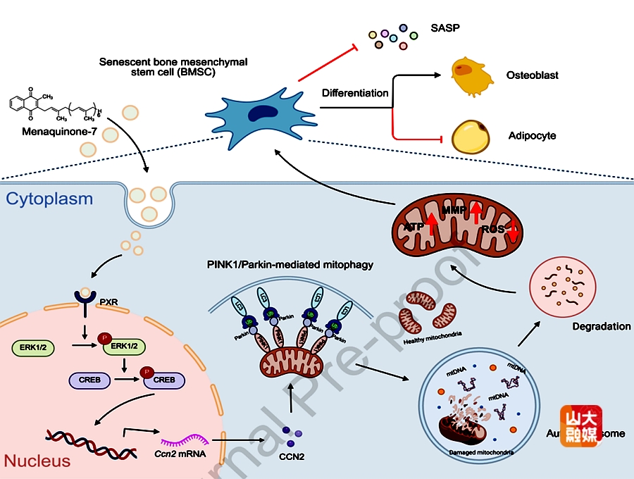 近日,司海朋团队在国际医学期刊Journal of Pharmaceutical Analysis(中科院1区Top期刊,IF: 8.9)在线发表了题为“Menaquinone-7 alleviates mitochondrial dysfunction and senescence in senile osteoporosis by targeting the PINK1-mediated mitophagy via PXR/ERK/CREB signaling pathway”的研究论文。该研究首次揭示,MK-7可作为新型治疗分子,通过靶向核受体孕烷X受体(PXR)发挥骨保护作用。这一机制不仅能逆转BMSCs的衰老表型,还能促进成骨分化并抑制脂肪分化,同时提升线粒体氧化磷酸化功能与ATP生成效率,最终改善老年小鼠的骨量丢失与骨微结构破坏。司海朋教授、山东大学齐鲁医院(青岛)实验中心教授扈培杰为共同通讯作者,骨科博士研究生徐羽为第一作者。