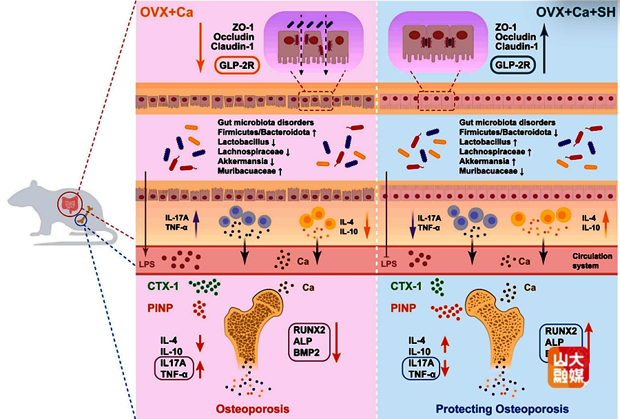 近日,司海朋团队在国际医学期刊Phytomedicine(中科院1区Top期刊,IF: 8.3)在线发表了题为“Shouhui Tongbian Capsule Promotes Calcium Absorption By Regulating Gut Microbiota and Protects Against Osteoporosis”的研究论文。该研究发现绝经后骨质疏松常伴随钙代谢紊乱与肠道功能异常,单纯钙补充易引发便秘、肠道屏障损伤等副作用,且难以有效提升骨量。司海朋教授团队的研究首次揭示,传统中药制剂首荟通便胶囊(SH)可通过调控肠道菌群稳态,构建“微生物-矿物质吸收-成骨”的调控网络,协同钙补充剂发挥骨保护作用。司海朋教授、王凯迪教授为共同通讯作者,骨科硕士研究生徐明钰、付清阳,博士研究生刘进城为共同第一作者。