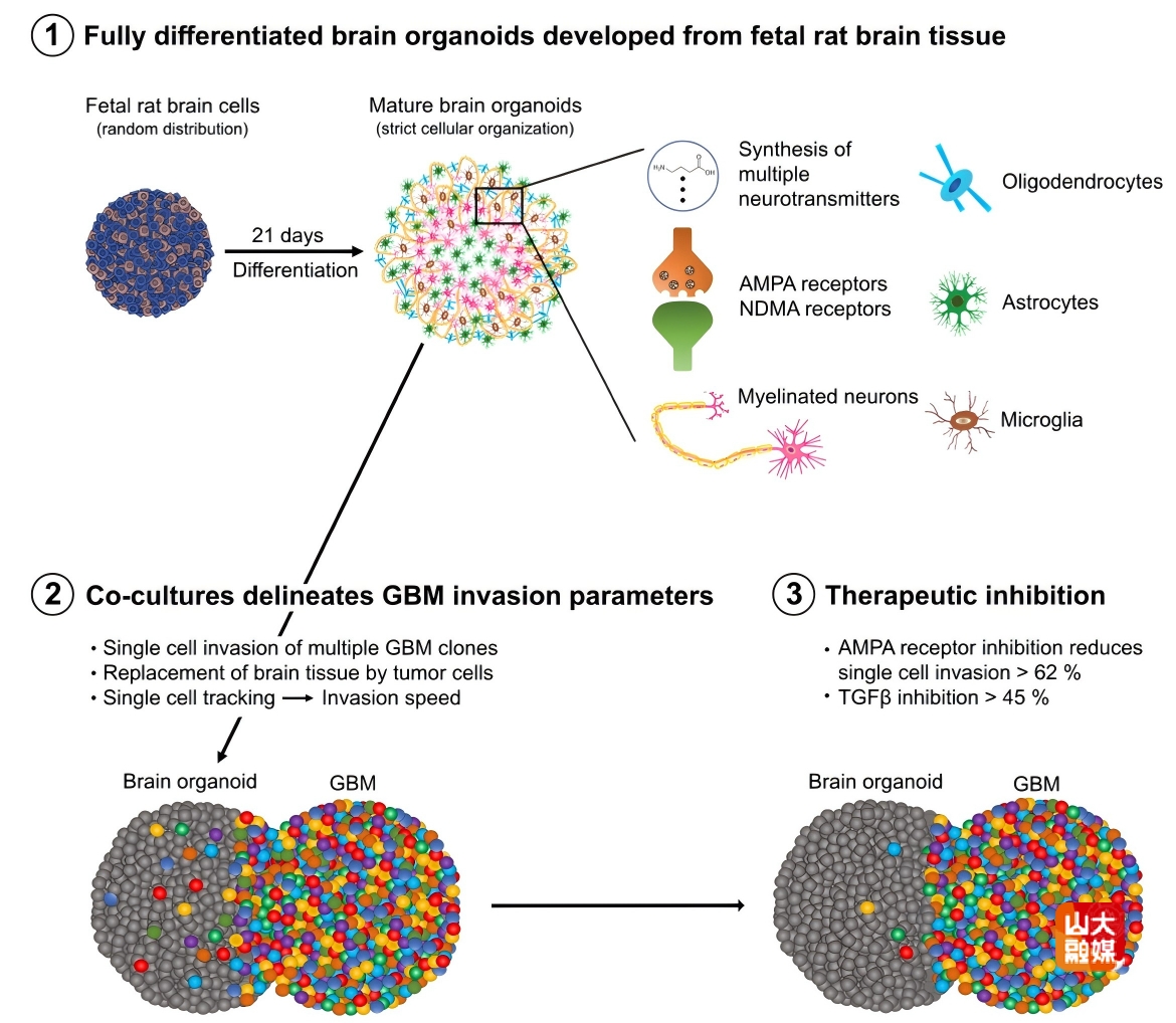 近日,山东大学脑与类脑研究院王剑教授团队与挪威卑尔根大学、山东大学兼职讲席教授Rolf Bjerkvig,在神经肿瘤学顶级期刊Neuro-Oncology(中科院一区TOP,IF: 16.4)发表题为“Development of a highly differentiated rat brain organoid model for exploring glioblastoma invasion dynamics and therapy”的研究论文。山东第一医科大学附属省立医院主治医师周文婧、卢森堡健康研究所Elena Martinez-Garcia、哈佛大学博士后Katharina Sarnow为该论文的共同第一作者,王剑教授和Rolf Bjerkvig教授为共同通讯作者。