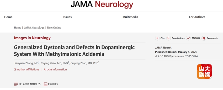 研究团队成员在2026年1月份JAMA Neurology(中科院一区Top,IF = 21.3)上发表病例报告,首次通过多巴胺转运蛋白PET成像,在一例因甲基丙二酸血症(MMA)导致严重全身性肌张力障碍的患者中,发现了双侧壳核多巴胺转运体结合下降的直接证据,从而将MMA相关运动障碍与多巴胺能系统缺陷直接关联。基于此发现,团队采用多巴胺能药物联合治疗,使患者症状获得改善。这一研究不仅深化了对MMA神经损伤机制的认知,更为此类难治性运动障碍提供了新的干预思路和确凿依据。该研究由齐鲁医院青岛院区医师张建园为第一作者,齐鲁医院教授赵玉英、齐鲁医院青岛院区教授赵翠萍为共同通讯作者。