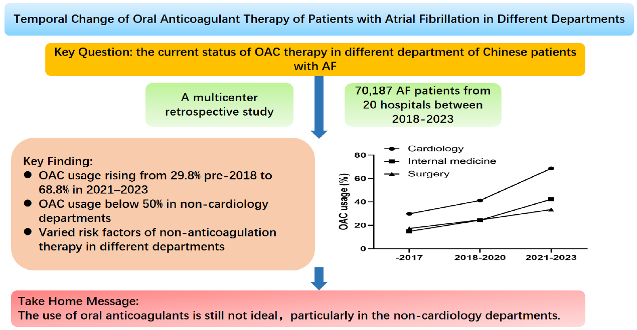钟敬泉教授团队联合武汉大学人民医院黄从新教授在国际期刊MedComm上发表了题为“Oral Anticoagulant Therapy of Patients With Atrial Fibrillation in Cardiology, Internal Medicine, and Surgery: Temporal Trend”的研究成果,山东大学齐鲁医院(青岛院区)心内科林明杰和武汉大学人民医院黄鹤教授为共同第一作者。研究首次全面评估了不同科室房颤患者口服抗凝药物的治疗现状及时间趋势。本研究研究结果显示,中国房颤患者口服抗凝药治疗率总体呈现上升趋势,尤其是心血管内科,抗凝治疗率从2018年前的29.8%显著提升至2021-2023年的68.8%。然而,非心血管内科(其他内科和外科)的抗凝治疗率仍低于50%,且三级医院的抗凝处方率显著高于非三级医院。研究特别发现,尽管77.4%的患者属于卒中高风险人群,但他们的抗凝治疗率并未高于非高风险组。影响因素分析表明,高龄、出血史、血红蛋白水平及联合抗血小板治疗是抗凝治疗的阻碍因素,而上游治疗则有助于抗凝治疗的实施。这一研究为进一步改善中国房颤患者抗凝治疗现状、促进跨学科合作提供了重要实证依据。