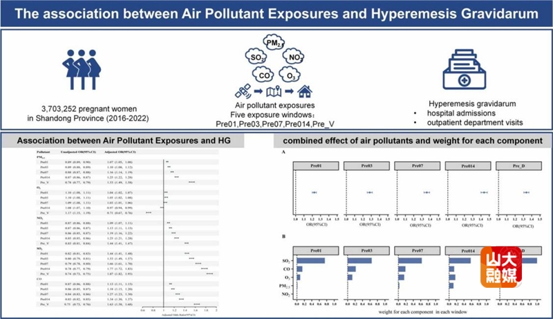 与北京大学的李钦副研究员团队合作题为“The association between air pollutant exposures and hyperemesis Gravidarum” 的研究,首次在大规模人群层面,系统评估了孕期暴露于多种空气污染物与妊娠剧吐发病风险的关联,并识别出相关关键影响因素。该研究纳入山东省370余万名孕妇的相关数据,结果显示,孕期暴露于多种空气污染物,均与妊娠剧吐风险呈显著正相关,其中二氧化硫(SO2)的关联度最强,是首要影响因素。分层分析还发现,20-25岁的年轻孕妇,对空气污染带来的不良影响更为敏感。