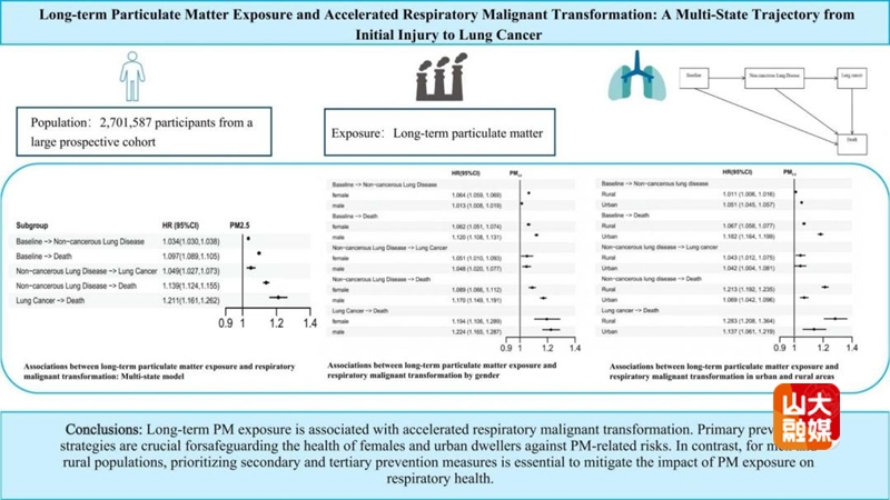 题为“Long-term particulate matter exposure and accelerated respiratory malignant transformation: A multi-state trajectory from initial injury to lung cancer”的研究,首次清晰描绘出长期颗粒物暴露推动呼吸系统疾病从“基线健康”到“非癌性肺病”、再到“肺癌发生”、最终走向“死亡”的完整恶性转化链条。该研究基于山东省270万成年人的7年随访数据,证实颗粒物暴露不仅会提升呼吸系统疾病的发病风险,还会加快疾病的发展转化进程。同时研究发现明显的人口学差异:女性和城市居民对PM2.5引发的肺病发病更为敏感,而男性和农村居民在PM2.5相关肺病的致死风险上,表现出更高的易感性。