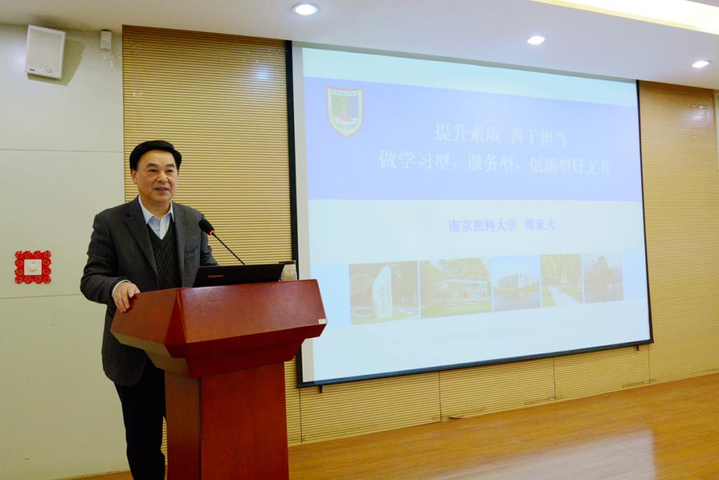 为深入学习贯彻党的十八届六中全会精神,教育引导党员干部把学习贯彻党的十八届六中全会精神与当前学校正在推进的“两学一做”学习教育结合起来,提高基层党委和支部书记的业务水平,切实落实全面从严治党要求,为学校“双一流”建设事业提供坚强的组织保障,11月21日,齐鲁医学部党工委邀请南京医科大学党委副书记周亚夫作《提升素质敢于担当 做学习型服务型创新型支书》为主题的专题党建报告。医学各学院领导班子成员,教工、学生党支部书记,齐鲁医学部机关党总支、党支部书记参加报告。报告由齐鲁医学部党工委副书记陈鑫主持。