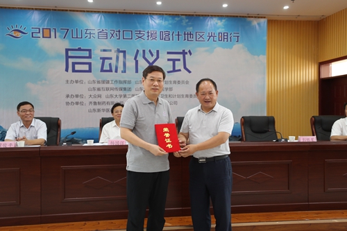 在启动仪式上,山东省援疆工作指挥部与山东省互联网传媒集团、山东大学第二医院共同签订2017年至2019年战略合作协议,共同出资开展为期三年的“喀什光明行”活动。该活动将为山东省对口支援四县(疏勒县、英吉沙县、岳普湖县、麦盖提县)的600位白内障患者免费实施手术。随后,齐鲁制药销售总公司、山东先大药业股份有限公司、山东新华医疗器械有限公司分别向山东省援疆工作指挥部捐赠了价值近30万元的滴眼液,成人钙片、益生菌,卡式灭菌器及相关配件两台。