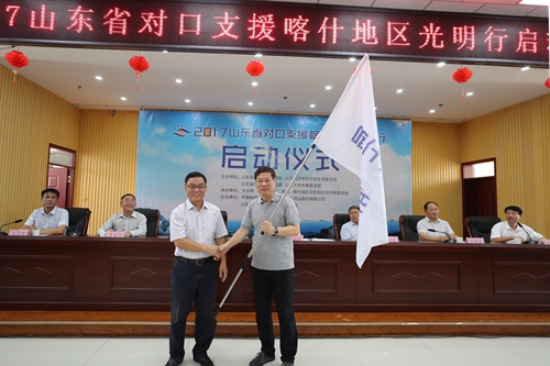 7月19日上午,“2017年山东省对口支援喀什地区光明行”活动在新疆喀什地区疏勒县人民医院正式启动。由山东大学第二医院眼科专家组成的援疆医疗队将深入疏勒县、英吉沙县、麦盖提县三地,为200名符合手术条件的白内障患者实施免费复明手术。本次活动还向新疆喀什地区捐赠价值近30万元的医药物资,助力山东医疗卫生援疆事业。