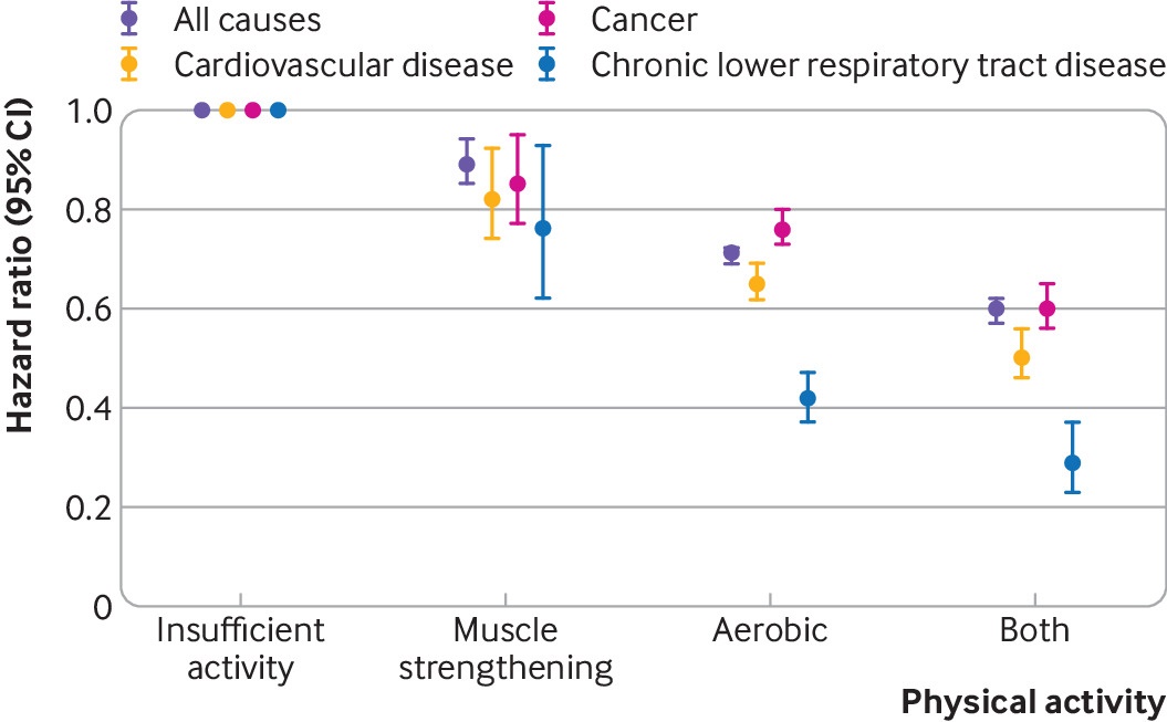 但是,目前尚未有研究报告满足2018年运动指南与成人全死因和死因别死亡的关系。研究团队纳入近50万成人数据,随访约9年时间,结果表明,与不常运动的人相比,同时满足2018年指南推荐的有氧和健身运动量,能降低40%的死亡;仅满足指南推荐的有氧运动量,能降低29%的死亡;仅满足指南推荐的健身运动量,能降低11%的死亡。此外,满足指南推荐的运动量还能降低心血管疾病、肿瘤、慢性下呼吸道感染、流感与肺炎以及老年痴呆等死因别死亡。该研究还指出,每周进行150分钟的低中强度运动与每周进行75分钟的高强度运动的健康获益相当,公众可根据自己的身体状况选择合适强度的运动类型。