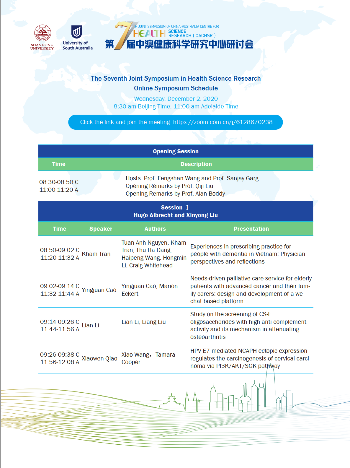 中澳健康科学研究中心(China-Australia Centre for Health Sciences Research, CACHSR)是由山东大学和南澳大学于2013年4月联合成立的国际科研合作机构,旨在促进山东大学和南澳大学在生物、医学等健康科学领域的合作。由山东大学齐鲁医学院主办的第七届中澳健康科学研究中心研讨会将于2020年12月2日以线上形式举行,会议将邀请来自山东大学和南澳大学健康研究领域的专家学者作报告,展示合作课题研究成果,交流科研和技术合作事宜;并进一步讨论中澳健康科学研究中心的未来发展。现将有关事宜通知如下: