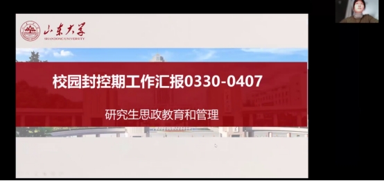 研究生线上教学方面本着线上教学与线下教学“同质等效”的目的,就强化教师业务培训、学生纪律要求、师生互动、教学督导、授课效果调查问卷等多方面进行总结,查摆短板,提出调整优化方案。学术盛宴“云端”交流不断线。为感受“大家”风范、赓续“大家”传承,研教办培养团队主题汇报了“医学大家面对面”系列活动的推出与推进,引领学生零距离“触摸”世界科技前沿,了解“大家”成长之路,传承齐鲁医学红色血脉,丰富“教”“学”相长的校园文化。