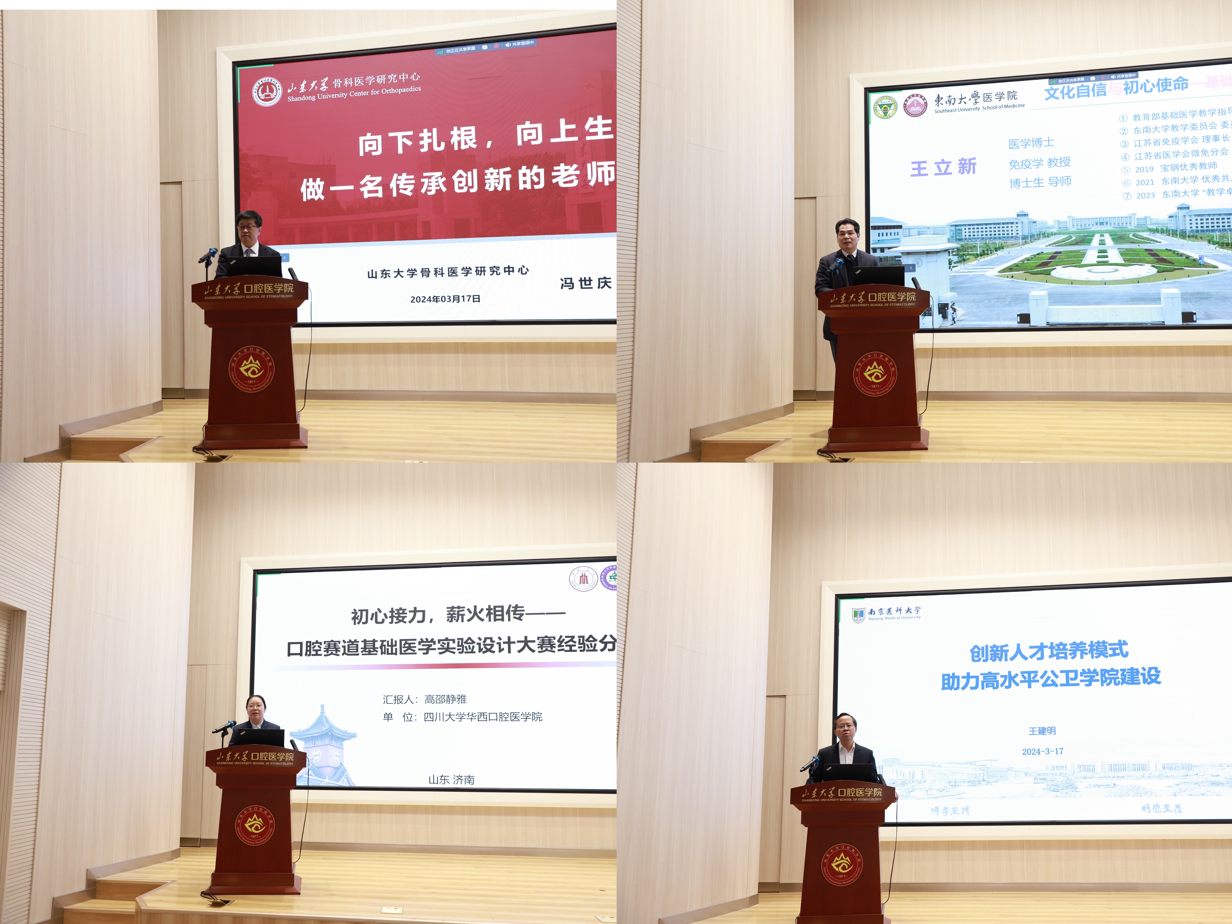 在教师分享环节,金奖导师冯世庆、高邵静雅、王立新、王建明分别带来了《向上生长 向下扎根—做一名传承创新的老师和学生》《文化自信与初心使命—基础医学创新大赛体会》《初心接力,薪火相传—口腔赛道基础医学实验设计大赛经验分享》《创新人才培养模式,助力高水平公卫学院建设》的主题经验分享。