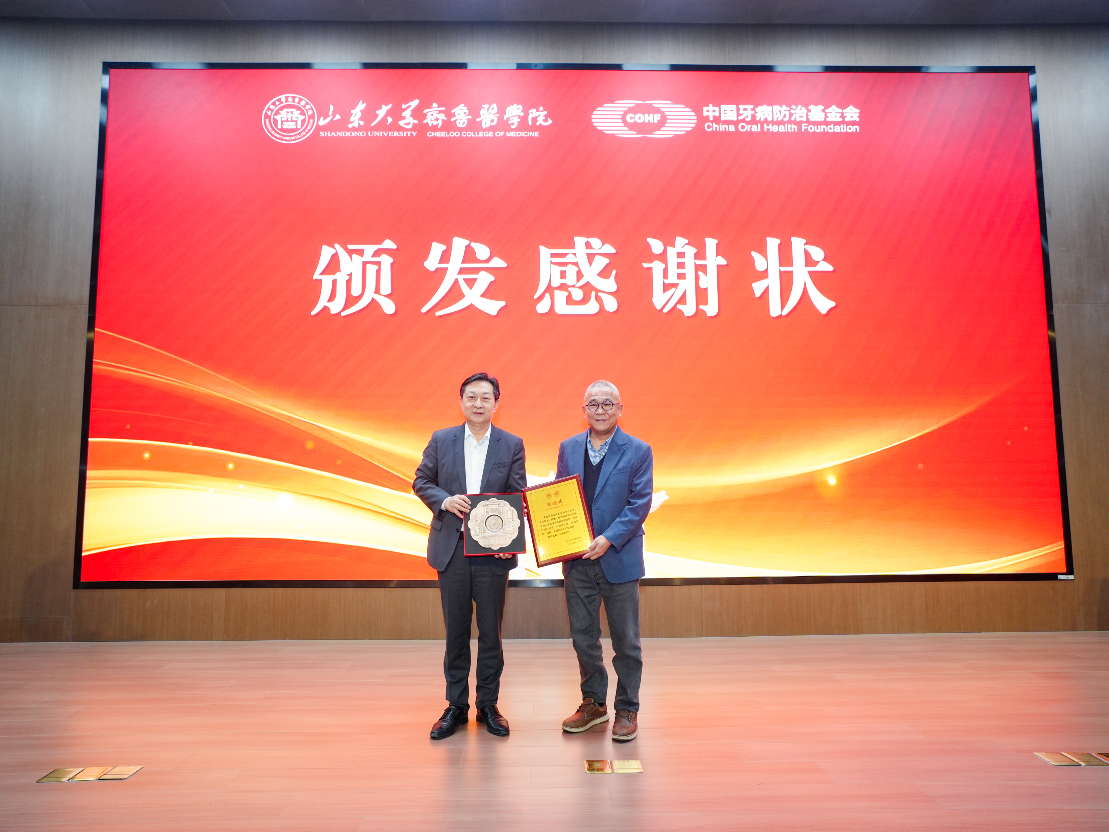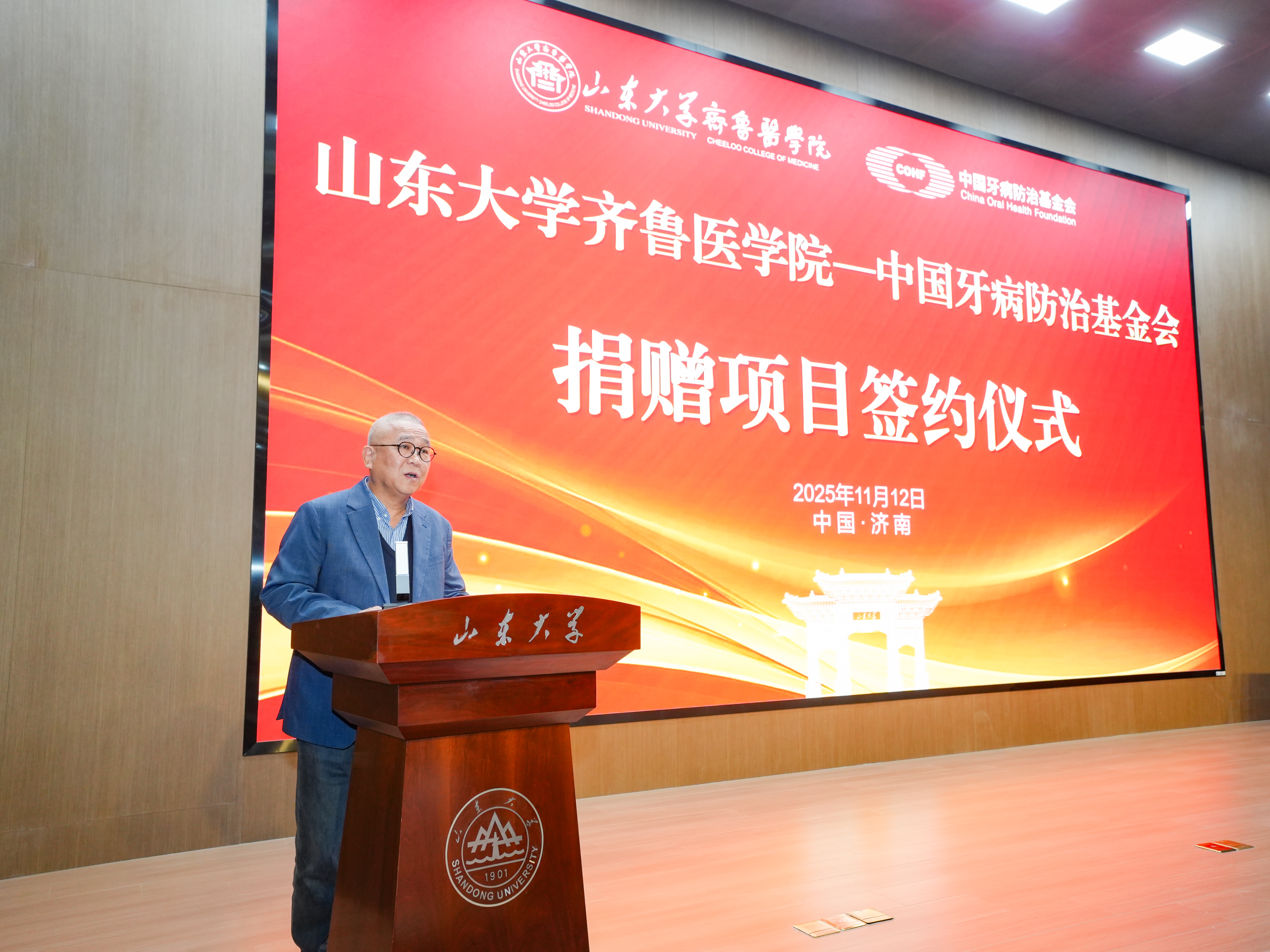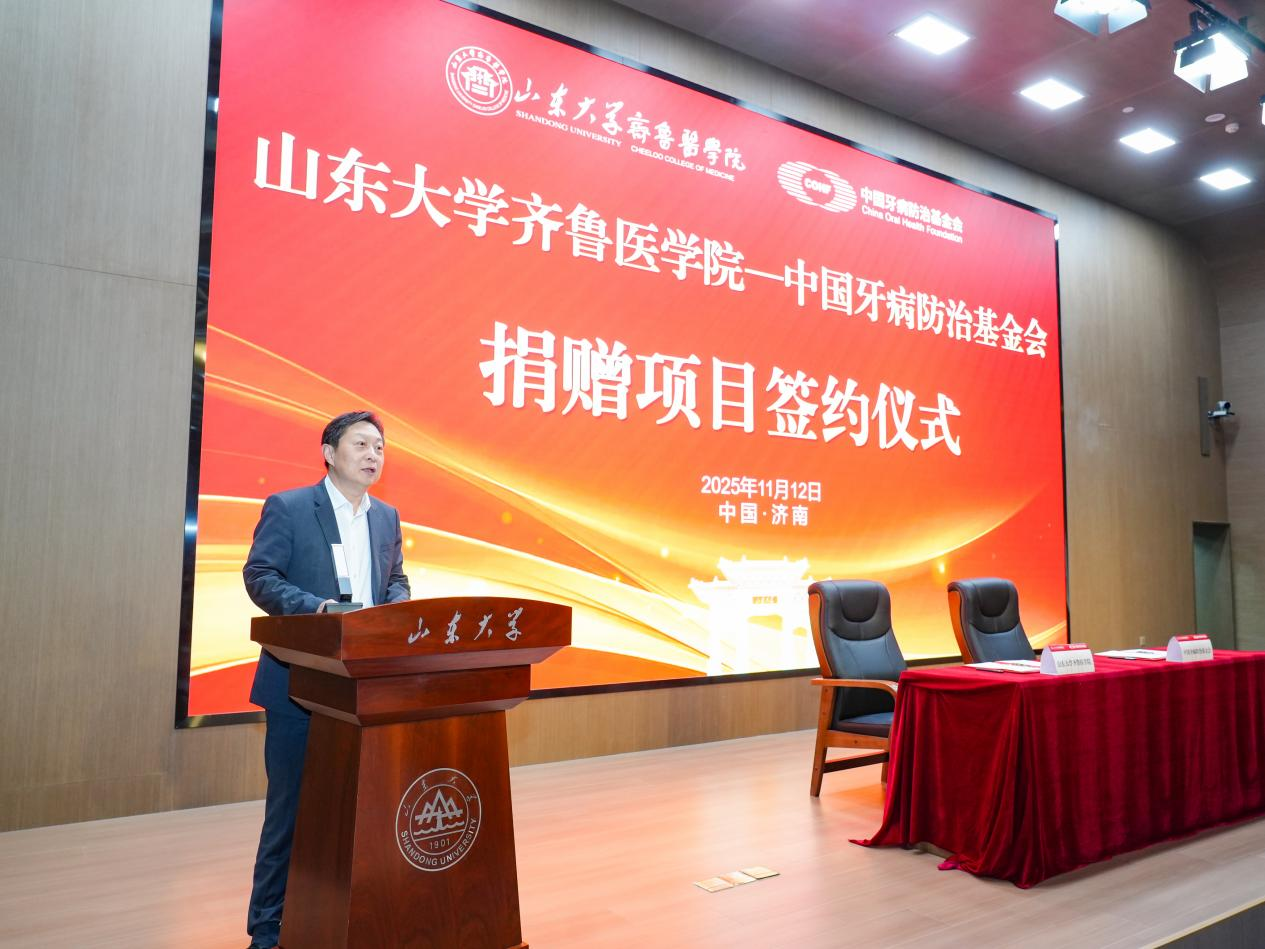 2025年11月12日,山东大学齐鲁医学院与中国牙病防治基金会“守护百万口好牙——焕新生活,从齿开始”捐赠仪式在趵突泉校区举行。中国牙病防治基金会理事长李铁军、常务副秘书长马莉莉,山东大学齐鲁医学院党工委书记、齐鲁医院(第一临床学院)党委书记陈鑫出席仪式。仪式由齐鲁医学院党工委副书记、公共卫生学院党委书记赵福昌主持。