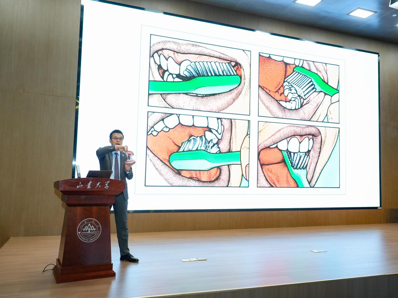 捐赠仪式结束后,北京大学口腔医院副主任医师许桐楷开展口腔清洁科普讲座,指导同学们掌握正确的口腔护理方法,成为身边人的健康榜样。