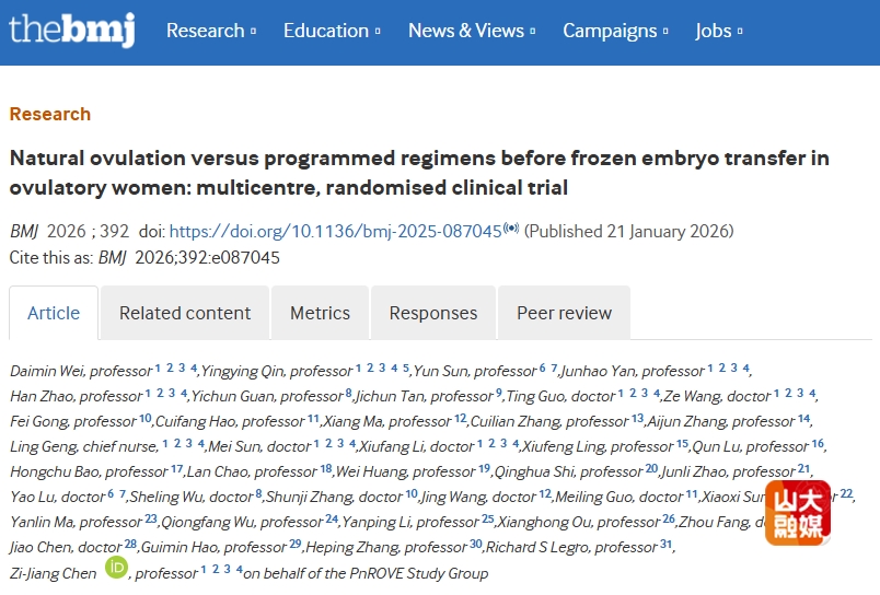 1月22日,生殖医学与子代健康全国重点实验室、山东大学妇儿与生殖健康研究院、山东大学附属生殖医院陈子江院士团队于国际顶级医学期刊BMJ在线发表一项最新多中心随机对照临床研究成果“Natural ovulation versus programmed regimens before frozen embryo transfer in ovulatory women: multicentre, randomised clinical trial”。研究结果显示,对于月经规律的女性,在冷冻胚胎移植周期中,采用自然排卵方案准备子宫内膜,相较于雌孕激素替代方案,可显著降低子痫前期、早期流产、胎盘植入、产后出血及剖宫产等多种孕产期并发症的风险。山东大学是本研究的第一作者单位和独立通讯作者单位。