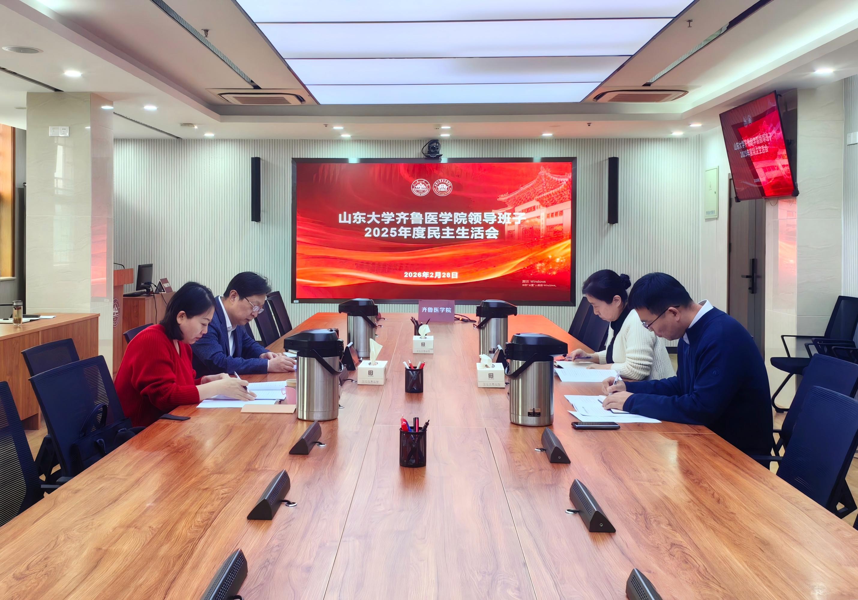 2月28日下午,山东大学齐鲁医学院领导班子召开2025年度民主生活会。学校第五督导组副组长李永卫到会指导。党工委书记陈鑫主持会议并做总结讲话,常务副院长马春红和副院长李岩参加会议。