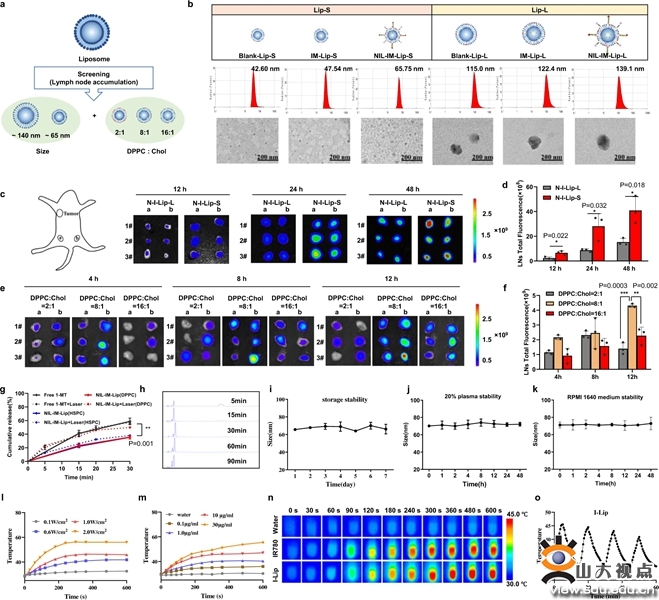 该论文设计了一种新型的pH/基质金属蛋白酶2(MMP2)/温度三敏感免疫调节纳米诱导剂(NIL-IM-Lip),将光热诱导剂IR780和IDO1抑制剂1-MT共同装载于温敏脂质体内部,在脂质体表面利用pH敏感的DSPE-Hyd-PEG修饰NGR靶头,MMP2敏感的DSPE-PEG-MMP2肽连接IL-15。首先,通过筛选纳米诱导剂的粒径及其胆固醇组份比例,以期获得最优肿瘤和淋巴结靶向的NIL-IM-Lip。研究结果显示,相较于大粒径脂质体而言,小粒径脂质体能够实现更多的淋巴结蓄积。此外,胆固醇组分比例也是影响脂质体淋巴结蓄积的重要因素,研究结果显示,DPPC:胆固醇在8:1时,脂质体表现出更优的淋巴结蓄积能力。因此,制备适宜粒径及胆固醇比例的脂质体能够实现肿瘤和淋巴结的高效蓄积。