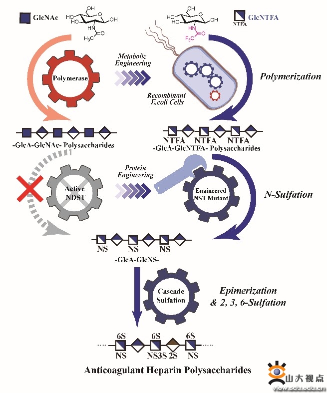 近日,药学院、国家糖工程技术研究中心生举正教授通过代谢工程和蛋白质工程的结合,开发了一种基于微生物系统的抗凝血肝素多糖合成策略,为动物源肝素类药物产业升级提供了新的策略。该成果以Biosynthetic Production of Anticoagulant Heparin Polysaccharides Through Metabolic and Sulfotransferases Engineering Strategies为题在《自然通讯》(Nature Communications)上发表,药学院博士研究生邓建群为论文第一作者,生举正教授为通讯作者,山东大学为第一作者和第一通讯单位。