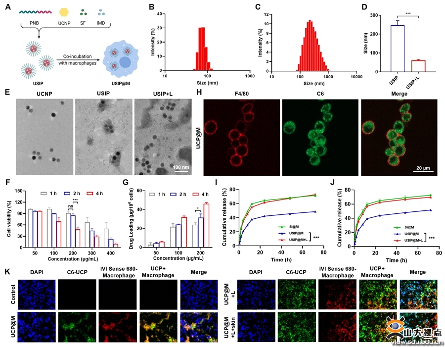 图2光定位控释巨噬细胞药物递送系统装载的纳米药物具有光敏解聚特征,能够实现光响应药物释放
