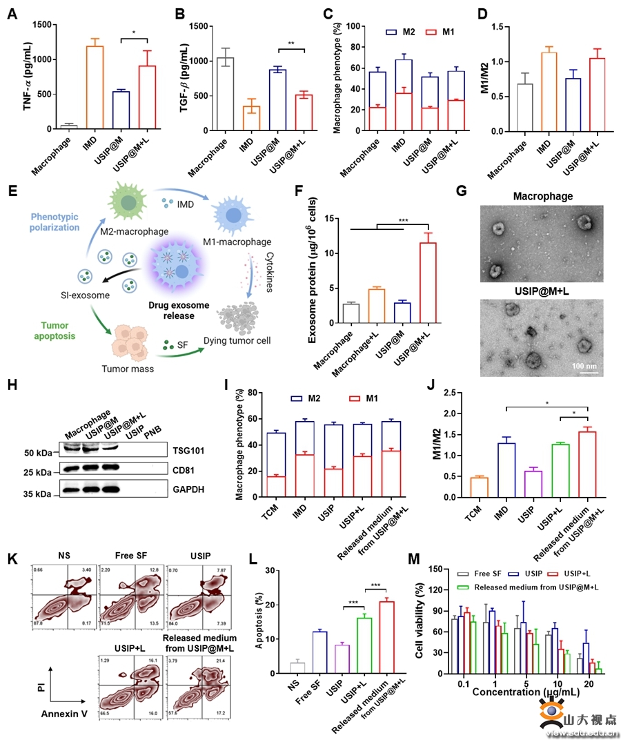 经静脉注射后,USIP@M依赖CCL2/CCR2信号轴主动靶向肿瘤部位,显著增强药物的肿瘤蓄积和深层渗透。经外部光源照射后,近红外光在肿瘤部位被转换为紫外光,纳米药物结构裂解,同时诱导外泌体产生,加速药物外排。通过USIP@M药物释放曲线和肿瘤组织切片实验,进一步证实USIP@M的光响应药物释放性能。由于药物以外泌体形式释放,显著增加了肿瘤细胞对药物的摄取,载体巨噬细胞和肿瘤相关巨噬细胞极化为具有抗肿瘤作用的M1型。联合索拉非尼的化疗作用,USIP@M具有更加显著的抗肿瘤作用。研究结果表明,USIP@M释放的药物能够有效促进肿瘤细胞凋亡,抑制肿瘤细胞增殖,在H22荷瘤小鼠模型和B16F10荷瘤小鼠模型中均显示了良好的抗肿瘤效果。该论文为基于活巨噬细胞的药物递送系统研究提供了新的思路。