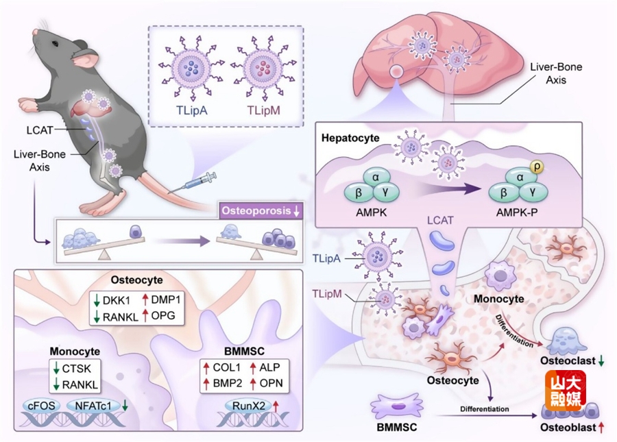 骨质疏松是一种以骨量减少和骨微结构恶化为特征的全身性骨病,已成为老龄化社会严峻的公共健康问题。尽管治疗骨质疏松的药物已经取得了显著效果,但是静脉注射后的纳米药物大部分会被肝脏截留吸收,导致到达骨骼部位并发挥作用的药物量较少,大大降低了药物的生物利用度。基于以上科学问题,合作团队开发了一种负载药物的靶向脂质体(简称TLipAM),通过靶向递送纳米药物和调控“肝-骨轴”双重机制,大大提高了药物利用度,实现了骨质疏松的有效治疗(图1)。该策略另辟蹊径,非特异性富集在肝脏部位的纳米药物增强了卵磷脂胆固醇脂酰转移酶(LCAT)的分泌,而LCAT可以通过“肝-骨轴”调控成骨并抑制骨吸收,将非特异性富集在肝脏部位的纳米药物变废为宝,为纳米药物治疗提供了新思路。该成果以“Integration of Bone-Targeted Delivery and Crosstalk Modulation of Liver-Bone Axis for Improved Osteoporosis Therapy”为题发表在ACS Nano。山东大学齐鲁医院教授刘新宇、王连雷,研究员高至亮,化学与化工学院教授崔基炜为该论文的共同通讯作者。山东大学齐鲁医院博士后尤云昊、冷少秋,博士研究生施杰为该论文的共同第一作者,山东大学齐鲁医院为第一和通讯作者单位。