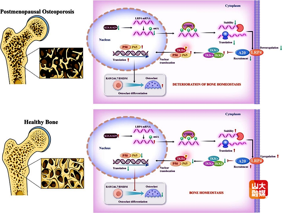 近日,司海朋团队在国际医学期刊Cellular & Molecular Biology Letters(中科院1区Top期刊,IF: 10.2)在线发表了题为“KIAA1429-mediated M6A methylation inhibits osteoclast differentiation via stabilizing Lrp4 mRNA and protects against osteoporosis”的研究论文。该研究首次揭示KIAA1429/LRP4/TNFAIP3轴在破骨细胞分化调控中的核心作用,提出基于m⁶A表观修饰靶向骨代谢失衡的治疗策略,为克服绝经后骨质疏松中破骨细胞过度活化的病理难题提供了新理论依据与潜在干预靶点,也为m⁶A修饰在骨代谢疾病中的转化应用奠定了基础。司海朋教授,山东大学齐鲁医院(青岛)实验中心副主任王凯迪为共同通讯作者;骨科博士研究生刘进城、硕士研究生付清阳为共同第一作者。