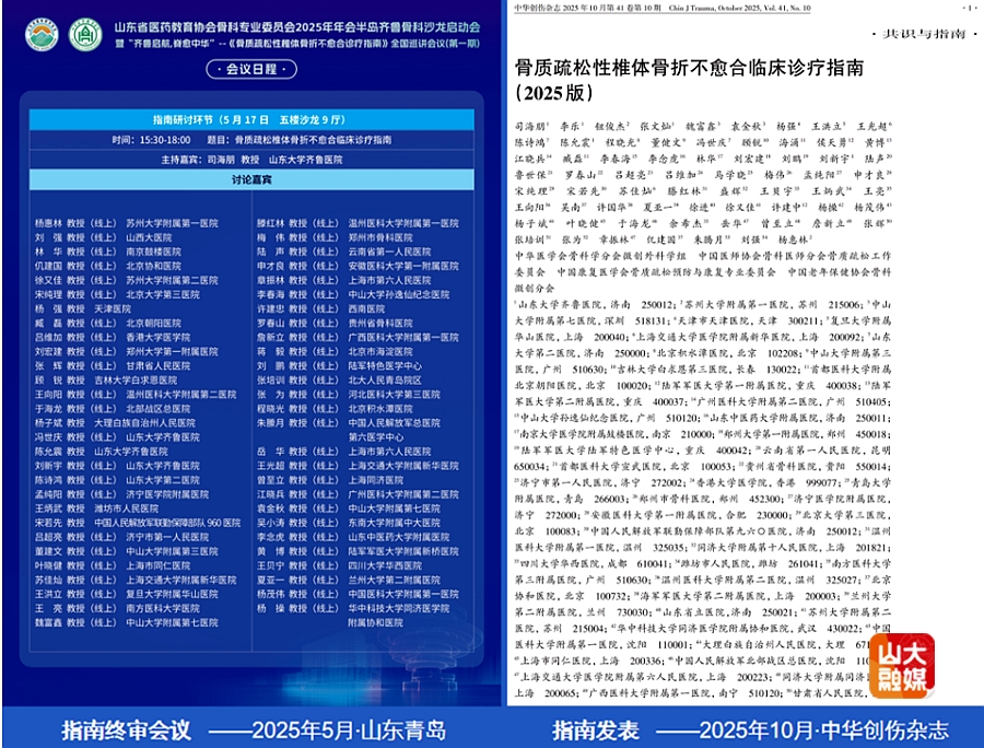 山东大学齐鲁医院(青岛)骨科中心司海朋团队始终坚持“基础研究赋能临床诊疗”的核心思路,聚焦骨质疏松性椎体骨折不愈合这一临床棘手难题,充分整合了团队在骨代谢调控机制、新型治疗靶点、中药协同干预等基础研究中的核心发现,同时结合其建立的超35000例骨质疏松骨折专病队列的真实世界数据,于2025年10月牵头制定并发布《骨质疏松性椎体骨折不愈合临床诊疗指南(2025版)》。该指南系统规范了疾病诊断标准、治疗方案选择及慢病管理路径,填补了该领域临床诊疗规范的空白。