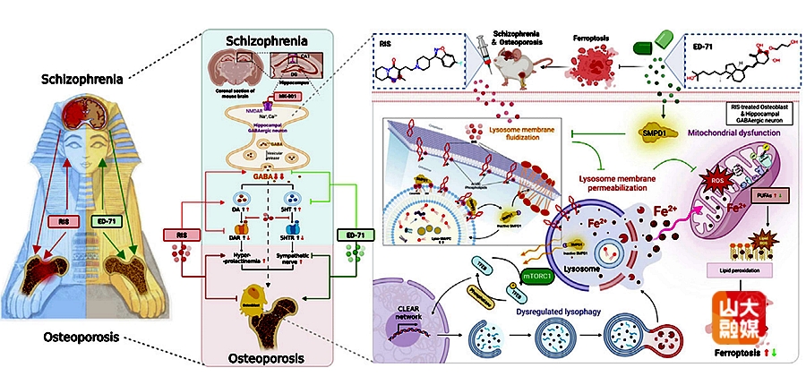 近日,司海朋团队在国际医学期刊Journal of Advanced Research(中科院1区Top期刊,IF: 13.0)在线发表了题为“Risperidone induces osteoporosis and neuropsychiatric treatment resistance via SMPD1-lysosome-mediated ferroptosis: dual rescue by active vitamin D analog ED-71”的研究论文。该研究发现抗精神病药物利培酮在治疗精神分裂症时,易引发骨质疏松等副作用,其机制与成骨细胞及海马GABA能神经元的交叉损伤密切相关。RIS通过靶向SMPD1 -溶酶体通路诱导铁死亡,而ED-71可通过双重机制逆转这一过程。山东大学骨质疏松与骨矿盐疾病研究中心主任李敏启,山东大学口腔医学院教授刘红蕊,司海朋教授为共同通讯作者。