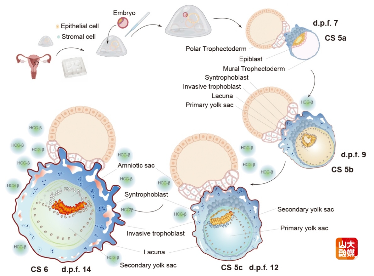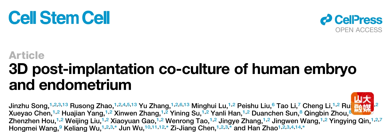 近日,山东大学妇儿与生殖健康研究院陈子江院士、赵涵教授、吴克良教授团队联合美国西南医学中心吴军教授团队在《细胞-干细胞》(Cell Stem Cell)期刊在线报道了题为“3D Post-Implantation Co-Culture of Human Embryo and Endometrium”的长篇研究论文。赵涵教授、陈子江院士、吴克良教授、吴军教授为本文共同通讯作者。山东大学妇儿与生殖健康研究院宋劲竹、南京医科大学副教授赵如凇、山东大学齐鲁医院博士后张玉为本文共同第一作者。山东大学为第一作者单位和通讯作者单位。