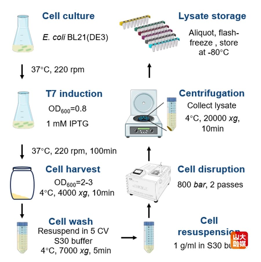 传统eCFPS系统通常需要多达35种反应组分,且各组分间潜在的抑制性相互作用。此外,核心原料——裂解液的制备流程繁琐,依赖run-off反应和透析等步骤,导致成本高、操作难、稳定性不足。