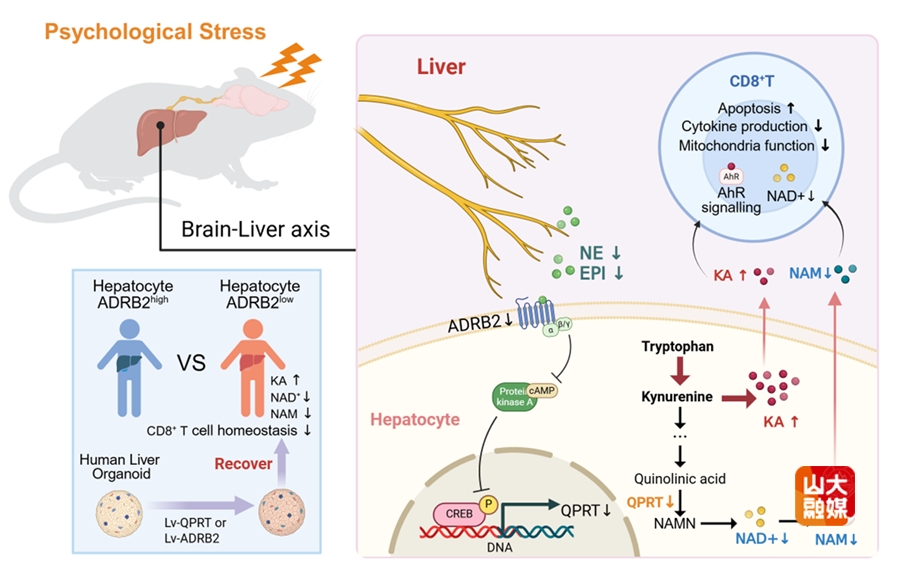肝脏作为代谢与免疫的关键器官,分布着丰富的神经末梢,然而心理压力究竟如何影响肝脏稳态,其机制并不明确。近日,基础医学院马春红教授/梁晓红教授团队研究发现,慢性应激破坏脑-肝回路,打破肝细胞色氨酸代谢平衡,从而抑制肝脏CD8+T细胞免疫应答,加速肝病进展的新机制。相关研究以“Chronic stress drives liver cancer by impairing the hepatic kynurenine pathway and immune surveillance”为题发表在Nature Metabolism杂志,梁晓红教授为通讯作者,博士研究生孙仁慧为第一作者,山东大学为第一作者和通讯作者单位。