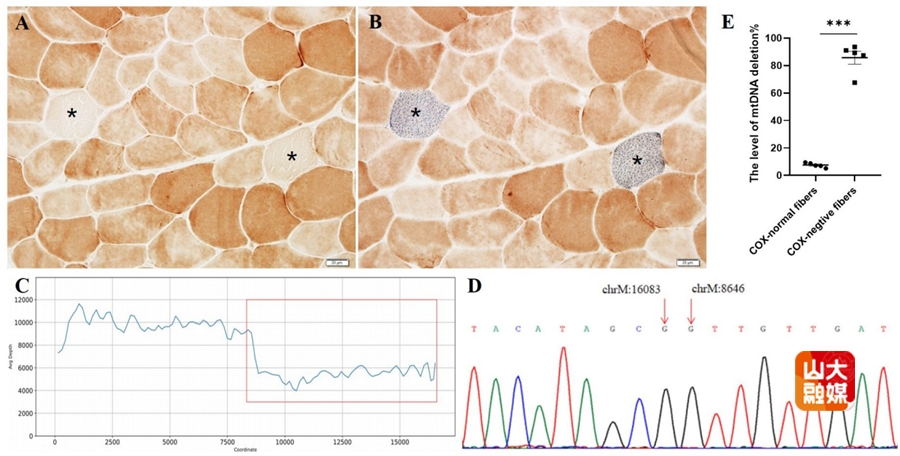 该团队在2026年1月在Annals of Clinical and Translational Neurology(中科院二区,IF = 3.9)杂志上报道了1例25岁的女性患者,主要表现为孤立性头部震颤,静息时不明显,饮水等动作时可诱发加重。患者有1型糖尿病、双侧听力下降病史。除血乳酸水平轻度升高外,其余实验室检查未见明显异常。颅脑MRI显示弥漫性脑白质病变。肌活检结果提示线粒体功能异常。进一步的核基因组全外显子测序未发现明确的致病性突变,但肌肉组织mtDNA测序显示存在m.8647-16082单一大片段缺失。通过实时荧光定量PCR对肌肉单纤维进行线粒体DNA缺失水平定量分析,结果显示,COX阳性肌纤维的缺失比例低于10%,而COX阴性肌纤维的缺失比例约为85%,进一步证实了该大片段缺失的致病性。因此患者被诊断为线粒体病并接受了辅酶Q10、艾地苯醌和复合维生素B治疗。在一年的随访中,头部震颤症状保持稳定。齐鲁医院神经内科博士研究生赵影、医师徐志鸿为论文第一作者,副主任医师纪坤乾为论文通讯作者。