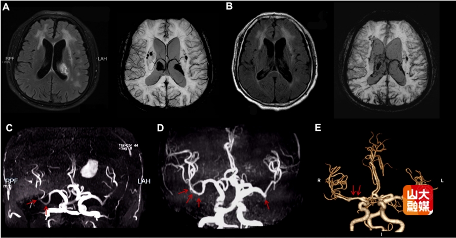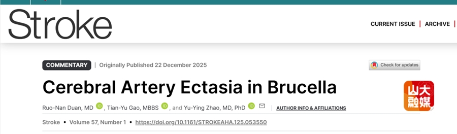 该团队在2026年1月份Stroke(中科院一区,IF = 8.9)杂志上报道了一例罕见的神经布鲁氏菌病相关脑血管病变。该研究通过动态影像学证据,首次完整展示了由布鲁氏菌感染引发的脑白质损害、脑出血及大脑中动脉串珠样扩张,经过抗感染治疗后呈现出动态改变。这一发现为感染相关脑血管病提供了全新的影像学表型,拓展了神经布鲁氏菌病的临床认知。齐鲁医院神经内科副研究员段若楠、医师高天宇为共同第一作者,赵玉英教授为通讯作者。