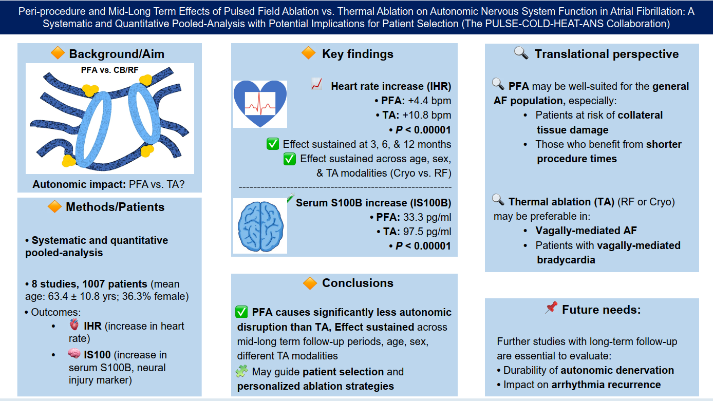 团队以通讯作者或核心专家身份在国际心律失常三大权威期刊(Europace、Heart Rhythm、Circ Arrhythm Electrophysiol)连续发表重要研究:钟敬泉教授与德国格雷夫斯瓦尔德大学医学院陈少杰教授等专家合作的国际多中心研究,在心律领域权威期刊Europace(中科院1区,IF=7.5)发表了题为Peri-procedure and Mid-Long Term Effects of Pulsed Field Ablation vs. Thermal Ablation on Autonomic Nervous System Function in Atrial Fibrillation的系统性汇总分析。该研究系统比较了脉冲场消融(PFA)与热消融(冷冻或射频)对房颤患者心脏自主神经功能的影响,共纳入8项研究1007例患者。研究发现,脉冲场消融后心率增加幅度显著低于热消融(4.41±8.86 bpm vs. 10.81±10.46 bpm),且血清神经损伤标志物S100B的升高幅度也明显低于热消融组(33.27±9.46 pg/mL vs. 97.53±31.88 pg/mL)。说明PFA作为一种新型非热消融技术,对心脏自主神经系统的损伤更小,这种保护作用在中长期(3-12个月)随访中仍持续存在,回答了临床上高度关注PFA是否导致脑神经损伤的问题。研究结果对房颤患者个体化消融策略的选择具有重要指导意义,也为PFA的推广应用提供了扎实的科学证据。