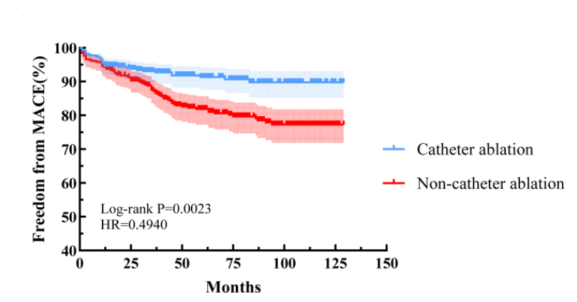 钟敬泉教授和张凯副教授在Heart Rhythm(中科院1区,IF=5.7)发表题为“Atrial fibrillation in patients ≤50 years: Clinical characteristics, treatment, risk of ischemic stroke, and outcomes”的研究,山东大学硕士研究生石右和山东大学齐鲁医院(青岛院区)心内科林明杰为共同第一作者。研究揭示青年房颤患者临床特征与预后,结果显示,研究队列中位年龄45岁,72.8%为男性,71.5%为阵发性房颤,患者的BMI和阻塞性睡眠呼吸暂停患病率随时间推移显著上升。在治疗方面,尽管队列中抗凝治疗使用率逐年上升,但超过50%的卒中高危患者(CHA2DS2-VA评分=1分或≥2分)中断了抗凝治疗。经过中位4.5年的随访,本队列共观察到238例MACE(发生率38.55/1000人年),其中心衰发作最为常见。此外,经倾向性评分匹配后分析显示,非消融组MACE发生率显著高于消融组(18.8% vs. 8.3%, P<0.001),导管消融治疗与MACE风险降低50%以上相关 (P=0.002;HR=0.494,95% CI:0.334–0.731)。提示≤50岁人群导管消融可显著降低心脑血管事件风险,推动早期干预策略优化。