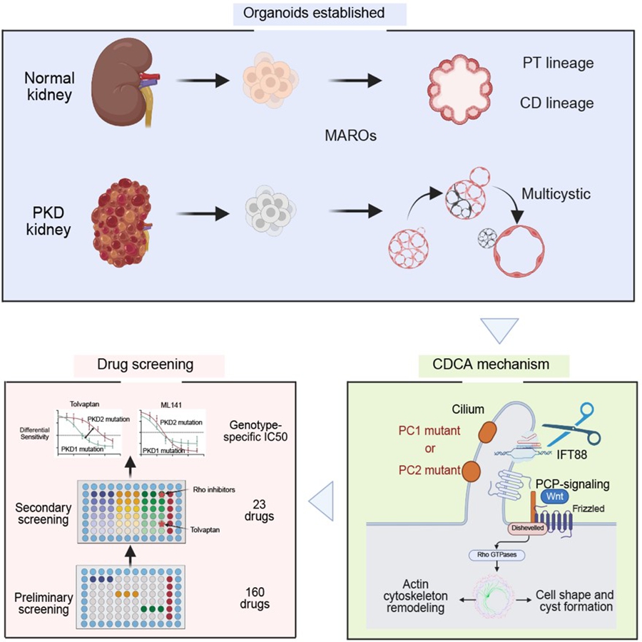 ADPKD是最常见的遗传性肾脏疾病之一,主要表现为肾脏囊肿进行性增大、肾实质损伤及肾功能持续下降,严重者可进展为终末期肾病。由于缺乏能够充分模拟成人起病特点、遗传背景及肾单位多节段来源的人源疾病模型,ADPKD的发病机制研究和药物筛选长期面临挑战。