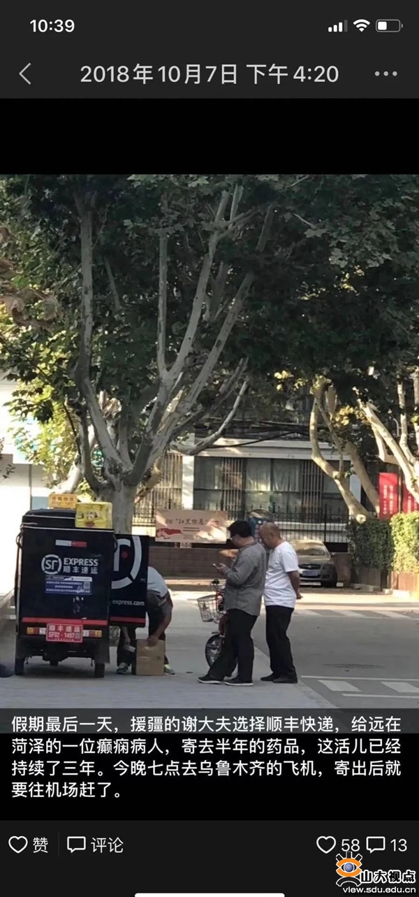 老人服用的一些药物在菏泽当地难以购买,谢兆宏便答应每半年帮他们快递寄一次药物。就这样一直坚持到现在,从未中断。即便是援疆期间,谢兆宏也会在回山东时,把药物给老人寄过去。直到后来,被同事看到他又在寄药,悄悄拍了张照片发到朋友圈,大家才知道这件事。